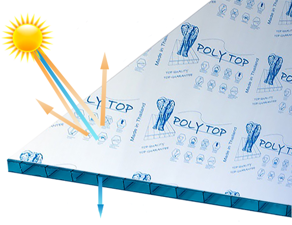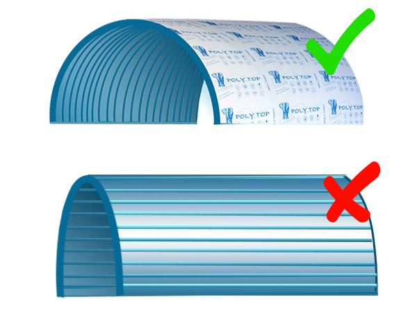 1. - The light and radiant energy from the sun has a harmful effect on polycarbonate. Multiwall polycarbonate features a UV-protected surface on one or both sides of the sheet. This UV protection prevents ultraviolet rays from deteriorating the polycarbonate, ensuring the sheet will not crack, yellow, or weaken from intense sun exposure. When installing multiwall polycarbonate, it is important to have the UV-protected surface facing up or towards the sun. Note: The masking film on the polycarbonate sheet indicates which side of the sheet is UV protected. |