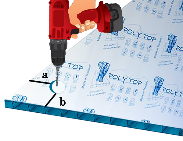 - Holes should be drilled at the range of 2 mm from the diameter of fasteners as this allows for thermal expansion during noontime and contraction at night. - All holes must be drilled at least 40mm from the edge of sheet |