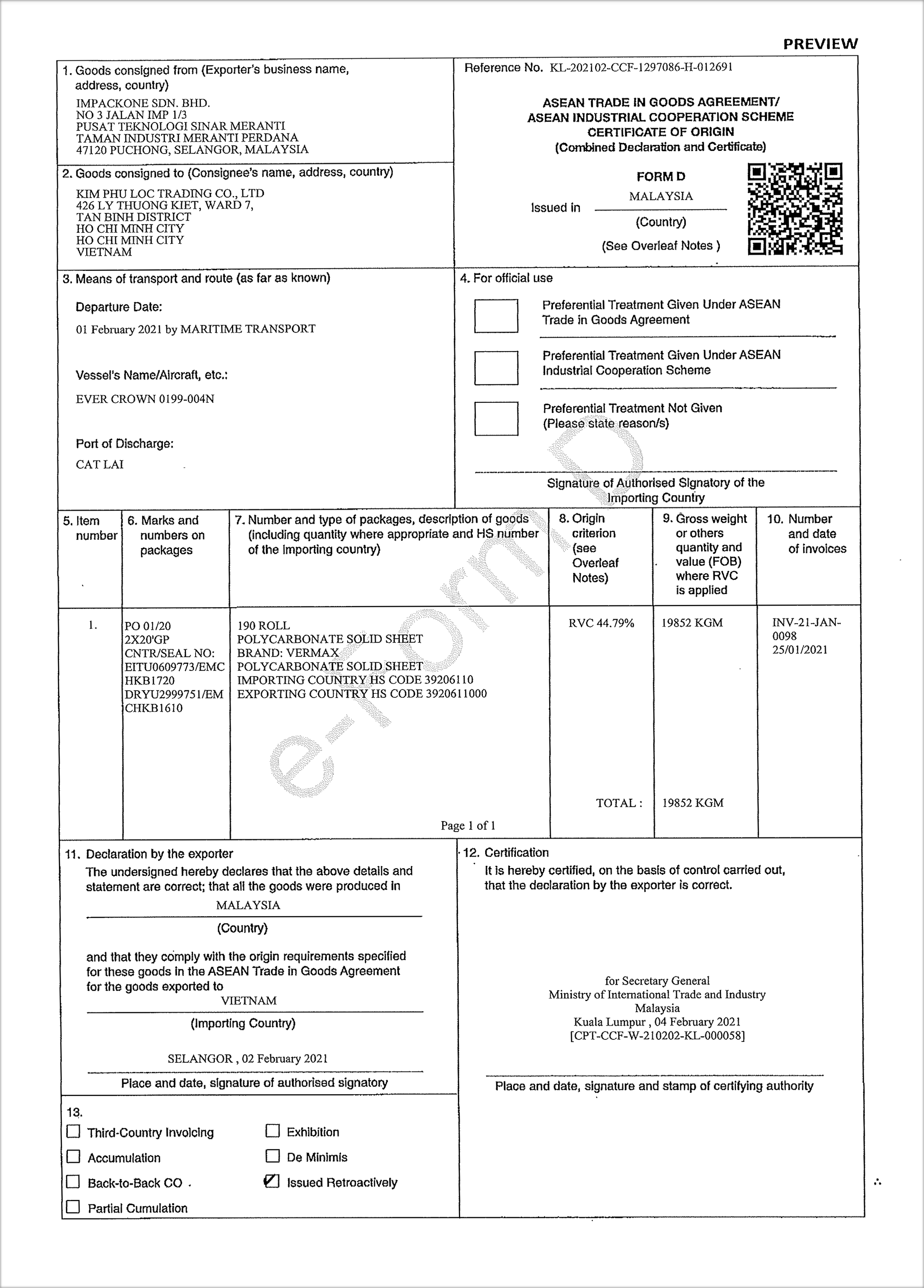 | CERTIFICATE OF ORIGIN | THICKNESS | SIZE | |